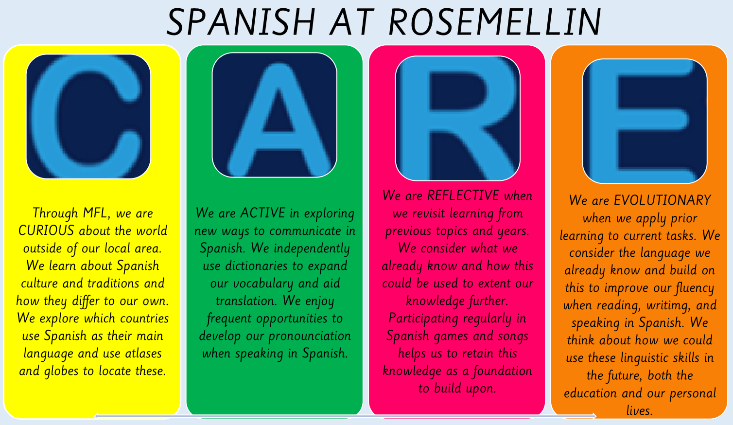 In KS2 at Rosemellin School, Spanish is taught through engaging, interesting and interactive lessons on a weekly basis.